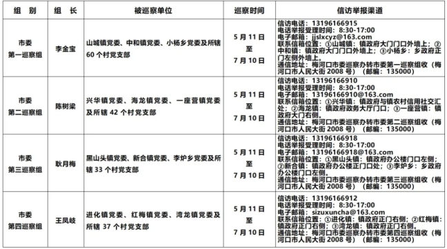 本輪巡察自2024年5月11日開始至7月10日結束,巡察期間,巡察組設聯系信箱、電子郵箱和信訪舉報電話,根據工作職責,市委巡察組主要受理反映被巡察黨組織班子成員、其他市管干部和重要崗位領導干部的問題舉報,重點是關于違反政治紀律、組織紀律、廉潔紀律、群眾紀律、工作紀律、生活紀律、中央八項規定精神和“四風”等方面的突出問題。其他不屬于巡察受理范圍的問題舉報,將按規定轉被巡察黨組織和有關部門處理,巡察組受理信訪時間截止到2024年7月5日。