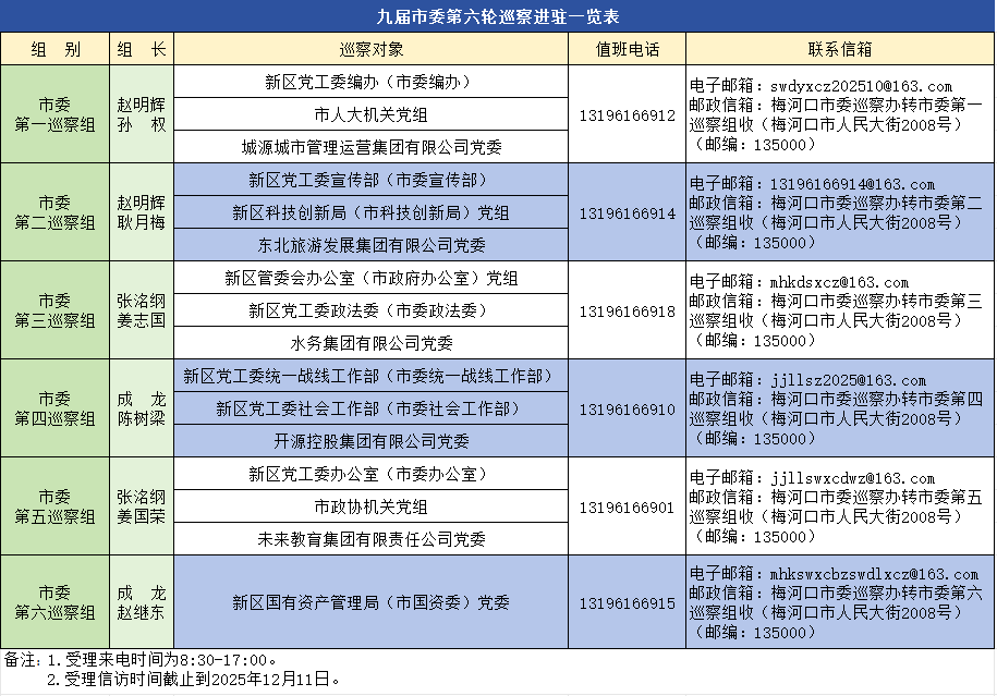 根據梅河新區黨工委(梅河口市委)巡察工作統一部署,截至10月17日,九屆市委第六輪巡察完成進駐工作。6個市委巡察組將對11個市直機關、部門(單位)、5個市管國有企業開展常規巡察。