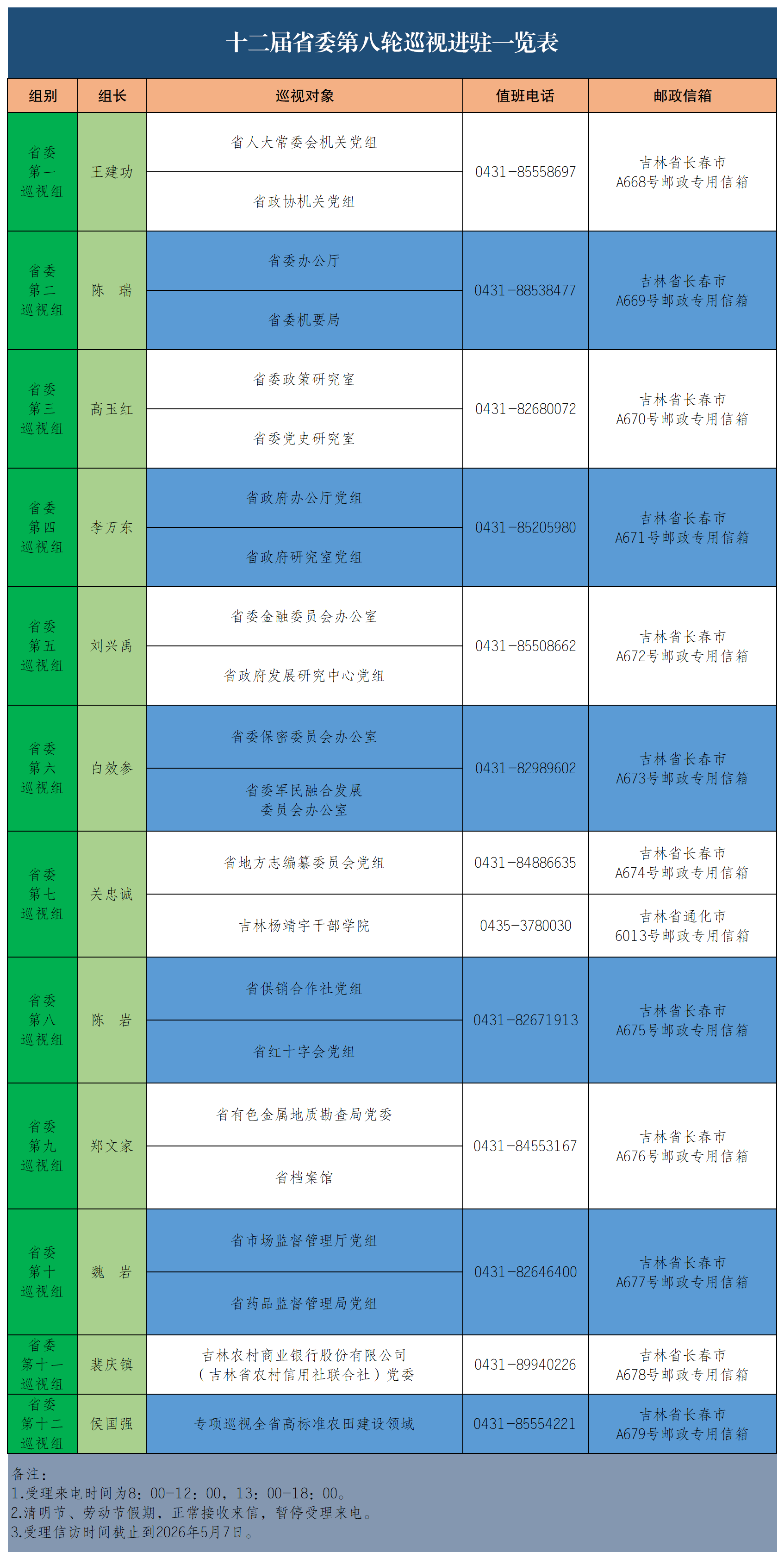 據悉,各省委巡視組現場巡視2個月左右,巡視期間設立專門值班電話和郵政信箱,主要受理反映被巡視黨組織領導班子及其成員、下一級黨組織主要負責人和重點崗位人員問題的來信來電,重點是關于違反政治紀律、組織紀律、廉潔紀律、群眾紀律、工作紀律、生活紀律等方面的舉報和反映。巡視組受理信訪時間截止到2026年5月7日。(宋威)