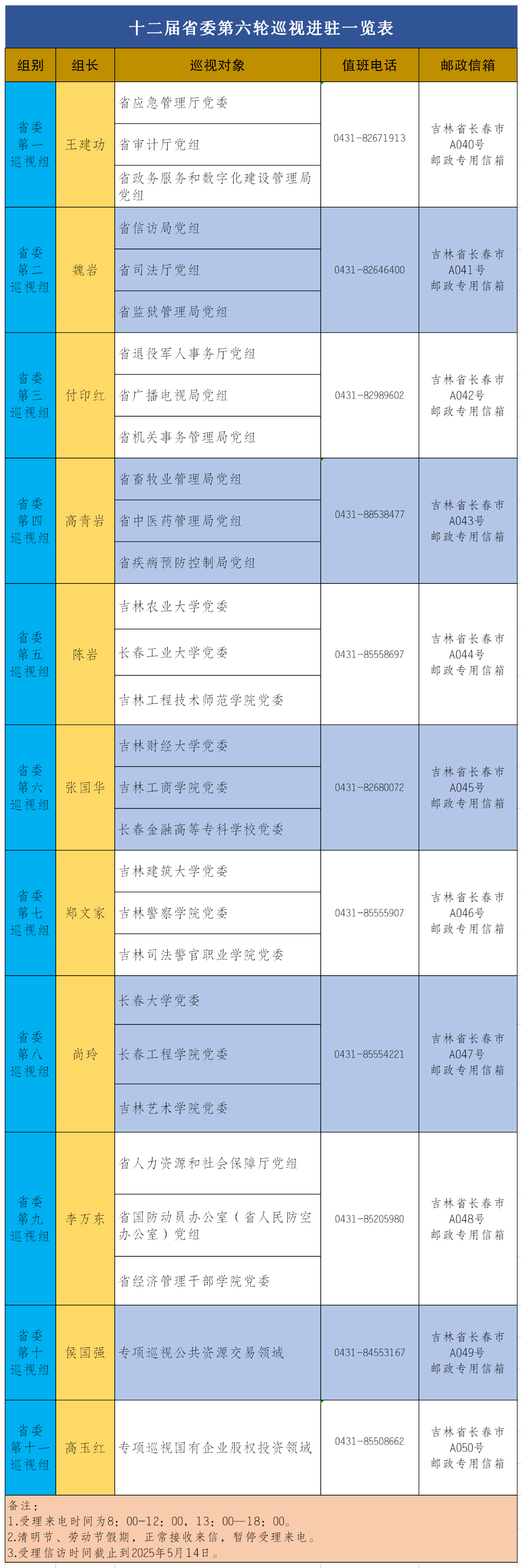 據悉,11個省委巡視組將在被巡視部門(單位)工作2個月左右,期間設立信訪舉報電話和郵政信箱,主要受理反映被巡視黨組織領導班子及其成員、下一級黨組織主要負責人和重點崗位人員問題的來信來電,重點是關于違反政治紀律、組織紀律、廉潔紀律、群眾紀律、工作紀律和生活紀律等方面的問題反映。巡視組受理信訪時間截止到2025年5月14日。